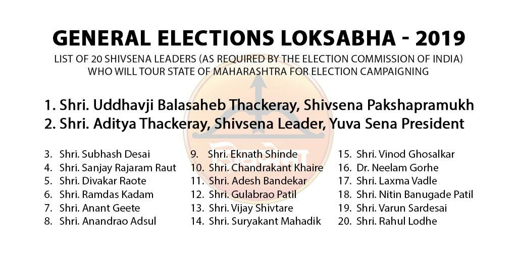 शिवसेना ने लोकसभा चुनाव के लिए अपने स्टार प्रचारको की एक लिस्ट जाहीर की है। लिस्ट में सुभाष देसाई , संजय राउत , विनोद घोसालकर सहीत कई और नेताओं के नाम है। ये सारे नेता पार्टी को ज्यादा से ज्यादा लोकसभा सीट दिलाने के लिए अलग अलग लोकसभा क्षेत्रों का दौरा करेंगे और पार्टी उम्मीदवार का प्रचार करेंगे।