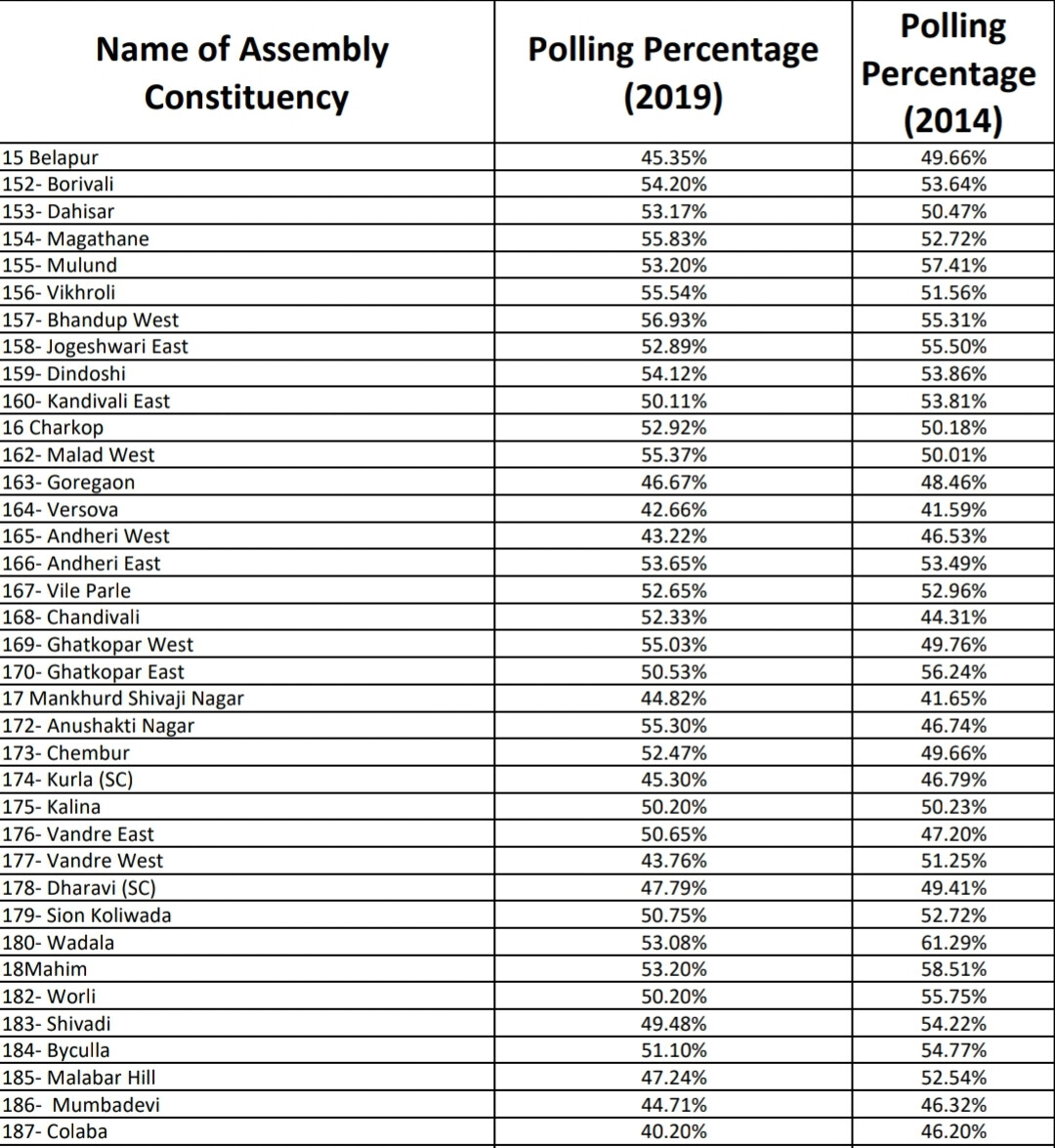 मुंबई के पॉश इलाको में माने जानेवाले कोलाबा में सबसे कम मतदान हुआ। कोलाबा में कुल मतदान 40.20 प्रतिशत ही रहा।आपको बता दे कि इस बार बीजेपी ने इस सीट में मौजूदा विधायक राज पुरोहित का टिकट काटकर राहुल नार्वेकर को दिया था।