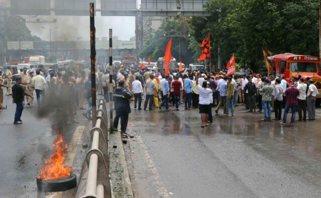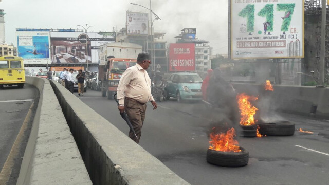 #MumbaiBandh: Stone pelting at #Sion-Panvel Highway as the the protests take a violent turn.