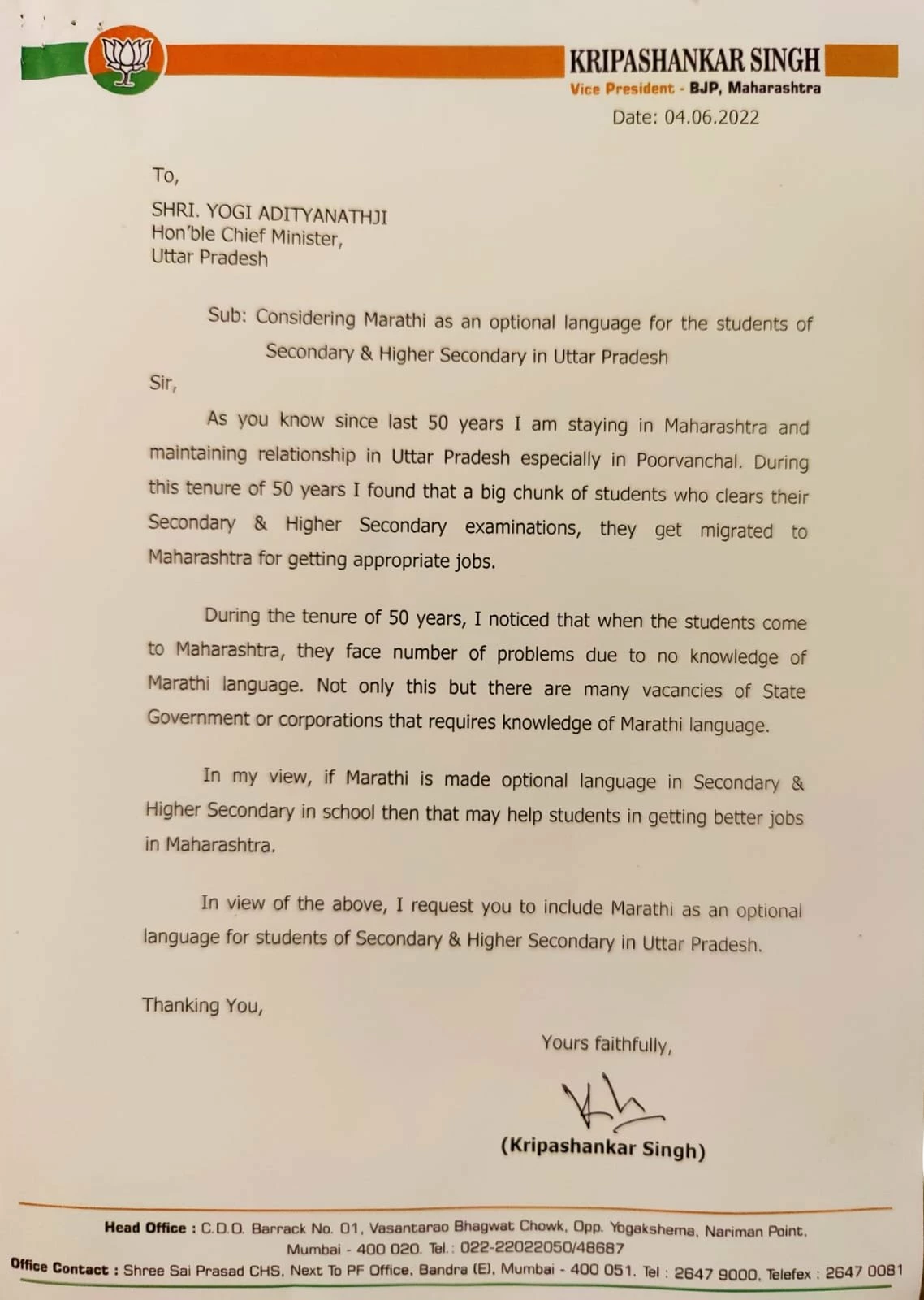 रोजगार के लिए मुंबई समेत पूरे महाराष्ट्र में उत्तर भारतीय युवा आ रहे हैं। जिसे लेकर महाराष्ट्र में काफी विवाद भी होता है। जिसे देखते हुए महाराष्ट्र के बीजेपी नेता कृपाशंकर सिंह ने उत्तर प्रदेश के मुख्यमंत्री योगी आदित्यनाथ को एक पत्र भी लिखा है। इस पत्र में कृपाशंकर सिंह ने योगी आदित्यनाथ से उत्तर प्रदेश के स्कूलों में मराठी पढ़ाने का अनुरोध किया है।