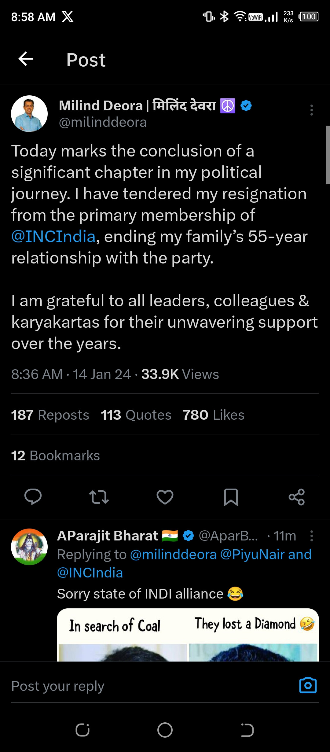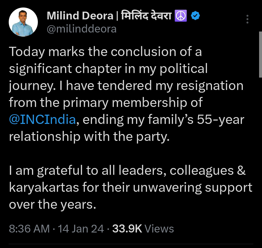 मिलिंद देवड़ा ने सोशल मीडिया एक्स पर लिखा "आज मेरी राजनीतिक यात्रा के एक महत्वपूर्ण अध्याय का समापन हुआ, मैने कांग्रेस की प्राथमिक सदस्यता से इस्तीफा दे दिया है, जिससे पार्टी के साथ मेरे परिवार का 55 साल पुराना रिश्ता खत्म हो गया है"
