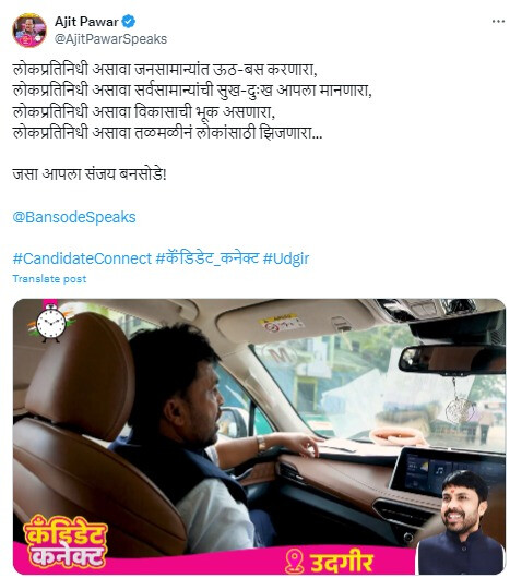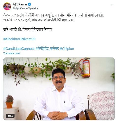 पांच मिनट लंबे वीडियो में उम्मीदवार अपने दोस्तों और परिवार के साथ बिताए खास पलों और यादगार घटनाओं को भी साझा करते हैं। चिपलून विधानसभा क्षेत्र के विधायक शेखर निकम से संबंधित एक वीडियो साझा करते हुए, अजित पवार ने उन्हें 'जनता का सच्चा प्रतिनिधि' बताया।