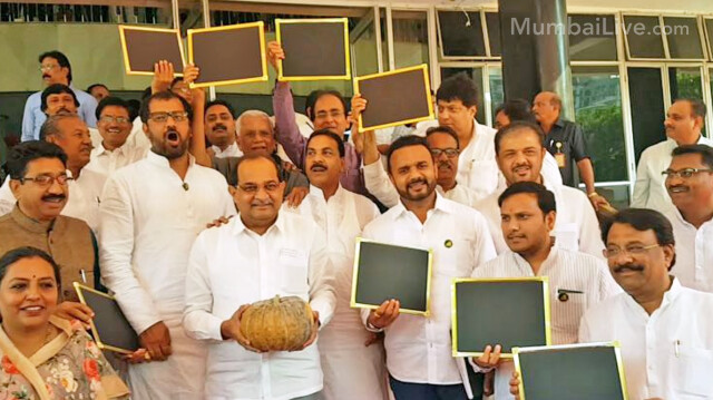 बजट के बाद विधानसभा में विरोध पक्ष नेता राधाकृष्ण विखेपाटील हाथ में कद्दू लेकर सरकार के खिलाफ नारेबाजी करते हुए अपनी नाराजगी जताई। साथ ही अन्य विधायकों ने भी हाथ में खाली स्लेट लेकर अपना असंतोष व्यक्त किया।