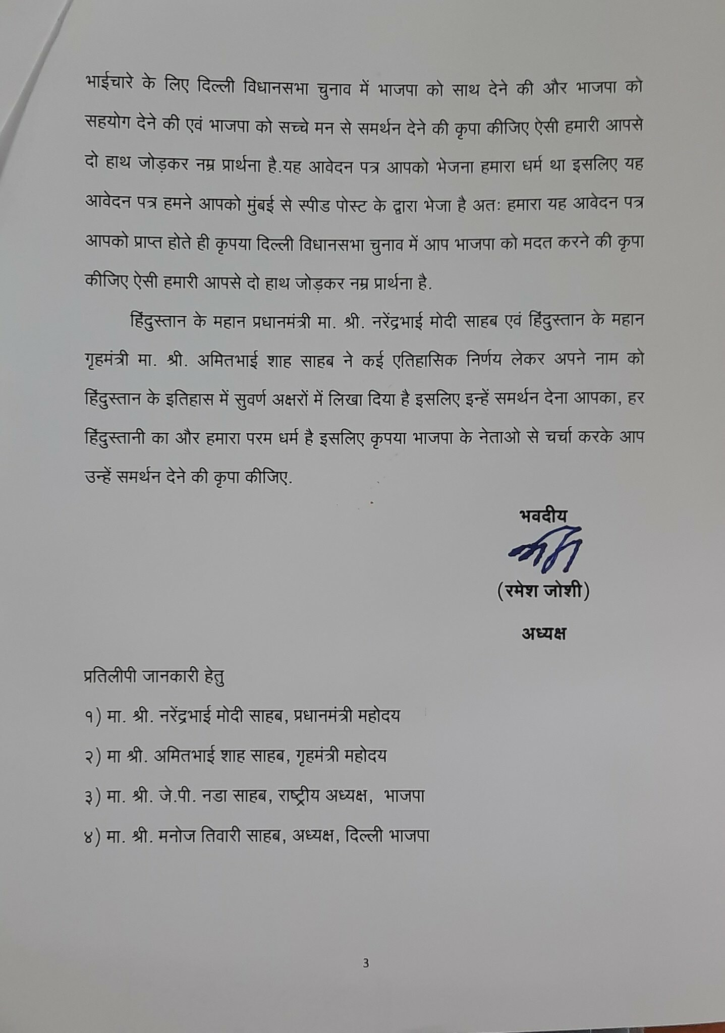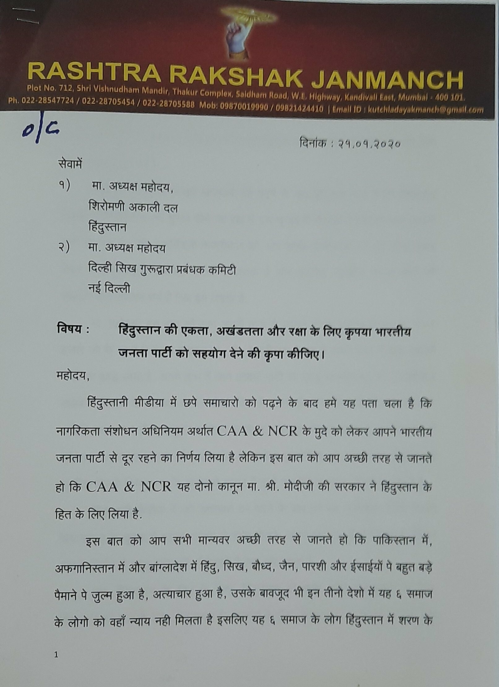 राष्ट्र रक्षक जनमंच के अध्यक्ष रमेश जोशी ने शिरोमणी अकाली दल और दिल्ली सिख गुरुद्वारा प्रबंधक कमिटी को पत्र लिखा है।