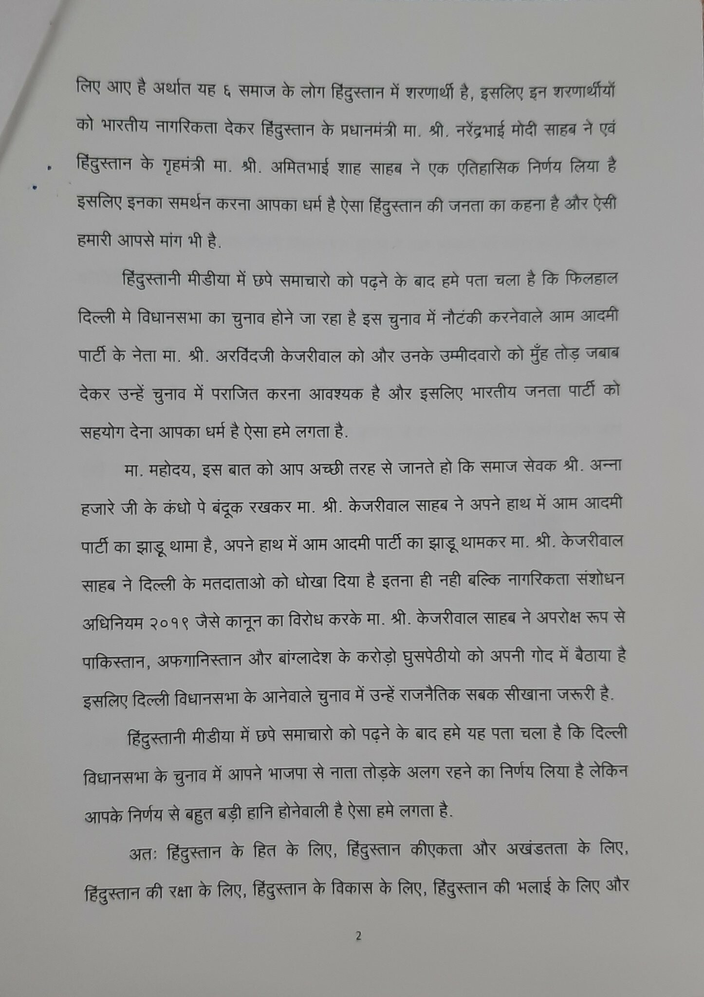 प्रधानमंत्री नरेंद्र मोदी जी ने CAA और NPR को लागू करने का फैसला देशहित में लिया है, प्रधानमंत्री नरेंद्र मोदी और गृहमंत्री अमित शाह ने CAA जैसा एतिहासिक फैसला लिया है जिससे पाकिस्तान, बांग्लादेश और अफगानिस्तान जैसे देशों के अल्पसंख्यक समुदाय के लोगों के साथ न्याय होगा, दिल्ली के मुख्यमंत्री अरविंद केजरीवाल ने समाजसेवक अन्ना हजारे के कंधे पर बंदुक रखकर दिल्ली की सत्ता तक पहुंचे है, ऐसे में प्रधानमंत्री नरेंद्र मोदी का साथ देकर 'आप' पार्टी को सबक सिखाना बेहद जरुरी है"