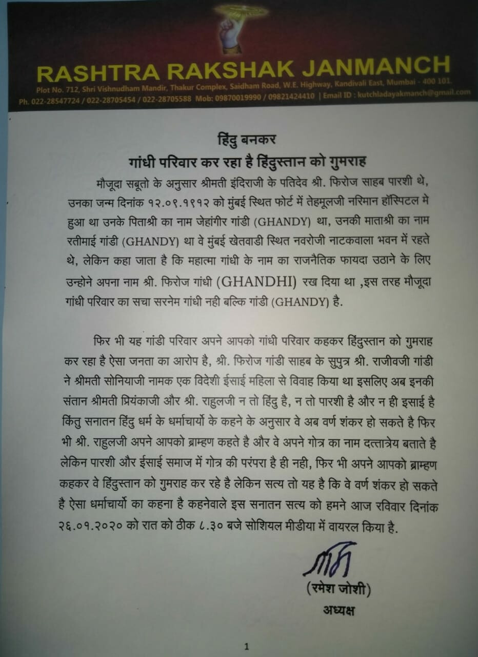 राष्ट्र रक्षक जनमंच (RASHTRA RAKSHAK JANMANCH) के अध्यक्ष रमेश जोशी(ramesh joshi) ने एक बार फिर से कांग्रेस की कार्यकारी अध्यक्ष सोनिया गांधी(sonia gandhi) और उनके पूत्र राहुल गांधी(rahul gandhi) के धर्म पर सवाल उठाया है। रमेश जोशी ने एक पत्र लिखकर सोनिया गांधी और राहुल गांधी के हिंदु होने पर सवाल खड़े किये है। रमेश जोशी ने कहा की दिवंगत इंदिरा गांधी के पति फिरोज गांधी पारसी थे और फोर्ट स्थित तेहमुलजी नरिमान अस्पताल के मुताबिक उनके पिता का नाम जेहागीर गांडी(GANDHY) था, लेकिन महात्मा गांधी के नाम का राजनीतिक फायदा उठाने के लिए उन्होने फिरोज गांधी नाम रख लिया।