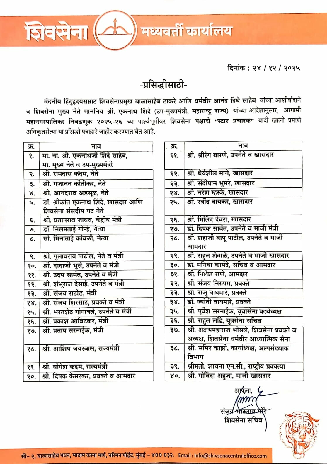 शिवसेना का मानना है कि स्टार प्रचारकों की यह टीम चुनावी मैदान में पार्टी की नीतियों, विकास कार्यों और संगठन की मजबूती को जनता तक पहुंचाने में अहम भूमिका निभाएगी। आने वाले दिनों में ये सभी नेता विभिन्न महानगरपालिकाओं में व्यापक जनसंपर्क और प्रचार अभियान चलाएंगे।