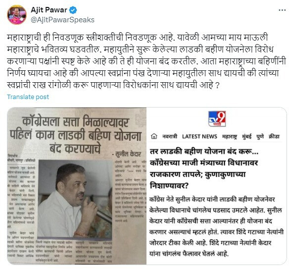 अपने X हैंडल पर कांग्रेस नेता सुनील केदार की 'माझी लाडकी बहिन योजना' पर टिप्पणी साझा करते हुए, अजित पवार ने कहा कि कांग्रेस ने घोषणा की है कि वह 'माझी लाडकी बहिन योजना' को बंद कर देगी और अब महिलाओं को यह तय करना है कि वे उस गठबंधन का समर्थन करती हैं जो उनके सपनों को पंख दे रहा है या उन लोगों का जो उनके सपनों को नष्ट करना चाहते हैं।