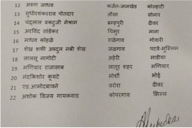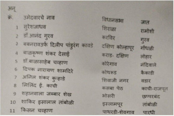 विधानसभा चुनाव को लेकर वंचित बहुजन आघाड़ी ने अपने 22 उम्मीदवारों की पहली सूची जारी कर दी है। इस सूची में उम्मीदवारों के नाम और इलाके सहित उनकी जातियों का भी उल्लेख किया गया है। इस सूची में कोल्हापूर, सांगली, पुणे, विदर्भ, लातूर, जलगांव और अहमदनगर क्षेत्र शामिल हैं।