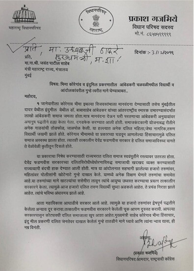 पत्र में कहा गया है कि तत्कालीन फडणवीस सरकार ने भीमा कोरेगांव में हुई हिंसा के कारण अनेक कार्यकर्ता और महिलाओं पर गंभीर धाराओं के तहत केस दर्ज किया है। साथ ही इंदु मिल आंदोलन में अनेक युवाओं पर भी केस दर्ज किये गये हैं। युवाओं पर लगे इस केसों को रद्द करेक इन्हें न्याय दिलाया जाए।