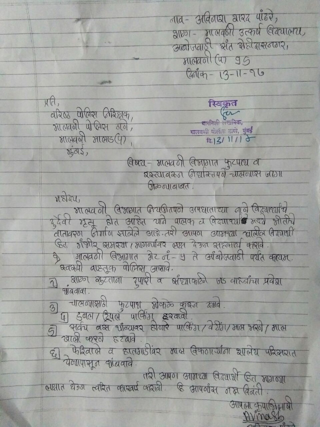 मालाड के मालवणी इलाके में स्थित उत्कर्ष विद्यालय के छात्रों ने इलाके में होनेवाली डबल, ट्रिपल ट्रैफिक की शिकायत स्थानिय पुलिस स्टेशन में की है। यहां की ट्रैफिक की स्थिती इतनी खराब हो गई है की हर रोज स्कूल जानेवाले छात्रों को लंबे ट्रैफीक का सामना करना पड़ता है और कई बार तो उनकी स्कूल बस भी लेट हो जाती है।