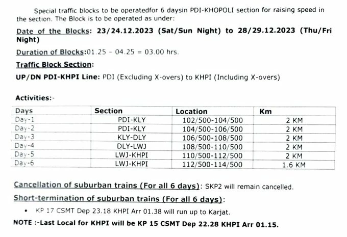 कर्जत से खोपोली के बीच चलने वाली उपनगरीय सेवाओं की गति को वर्तमान 60 किमी प्रति घंटे से बढ़ाकर 90 किमी प्रति घंटे करने के लिए ट्रैक और अन्य कार्य किए जा रहे हैं। कुल 6 दिनों का ब्लॉक इस प्रकार रहेगा। (6 days block between Karjat and Khopoli)