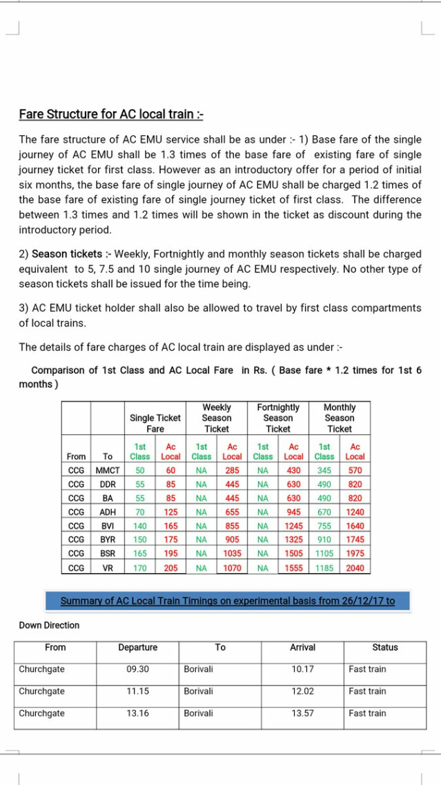 जहां चर्चगेट से बोरिवली के लिए आपको आम लोकल में एक महिने के पास के लिए 755 रुपये देने होते है तो वही इस नए एसी लोकल में एक महीने के पास के लिए आप 1640 रुपये देने होगे , जो लगभग प्रथम श्रेणी का तीन गुना है।