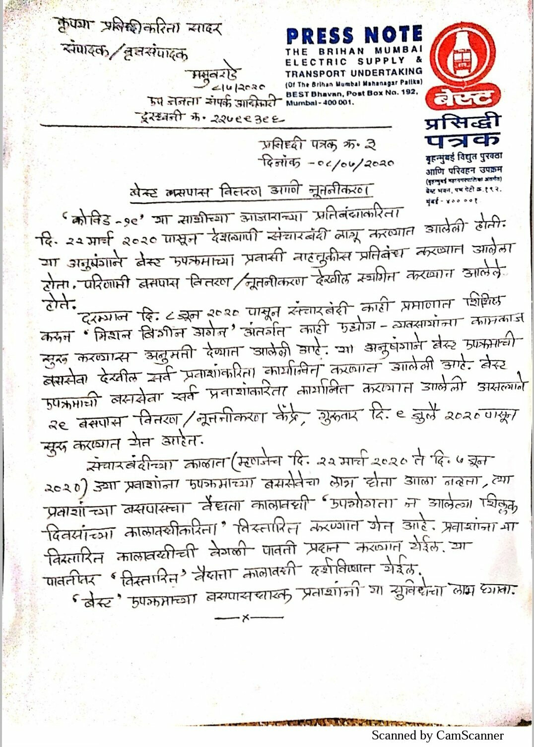 9 जुलाई यानी की आज से बेस्ट की बसों के पास का नवीनीकरण (रिन्युअल) शुरु किया जाएगा। इसके साथ ही बेस्ट आज से नये बेस्ट के पास को जारी करना भी शुरु कर देगी। बेस्ट मे एक प्रेस रिलीज जारी करते हुए कहा की 8 जून को मिशव बिगन अगेन के तहत कई कंपनियों और कार्यलयों को सीमित कर्मचारियों के साथ काम करने की अनुमती दी गई है , लिहाजा अब बेस्ट ने भी लोगों के लिए बेस्ट बसों की सेवा शुरु कर दी है। बेस्ट ने 9 जुलाई से बसों के पास के नवीनीकरण और नये पास जारी करने का फैसला किया है।