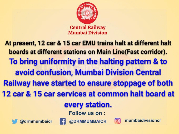मध्य रेलवे पर यात्रियों की यात्रा को और भी आरामदायक और सुविधा जनक बनाने के लिए मध्य रेलवे प्रशासन ने एक और अहम फैसला लिया है। वर्तमान में 12 कोच और 15 कोच ईएमयू ट्रेनें मुख्य लाइन (फास्ट कॉरिडोर) पर अलग अलग स्टेशनों पर अलग -अलग हाल्ट बोर्ड पर रुकती हैं। (Mumbai Division Central Railway have started to ensure stoppage of both 12 car & 15 car services at common halt board at every station)