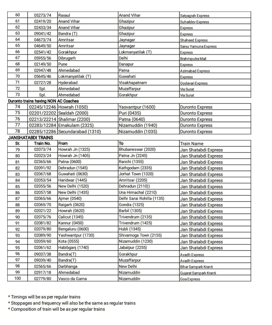 देश मे 30 राजधानी स्पेशल ट्रेनें पहले से ही चल रही हैं।1 जून से 200 ट्रेन और शुरू होने जा रही है , हम इन ट्रेनों का पूरा टाइम टेबल, स्टेशन और स्टॉपेज की पूरी जानकारी देने जा रहे हैं। इससे आपको सफर करने में आसानी होगी। यात्रियों को कोरोना वायरस संक्रमण को देखते हुए एहतियात बरतने को कहा गया है। साथ ही रेलवे ने सूचित किया है कि स्टेशनों में भीड़ और सुरक्षा को देखते हुए फेस मास्क का इस्तेमाल करें। साथ ही शारीरिक दूरी का पालन करने को भी कहा गया है।
