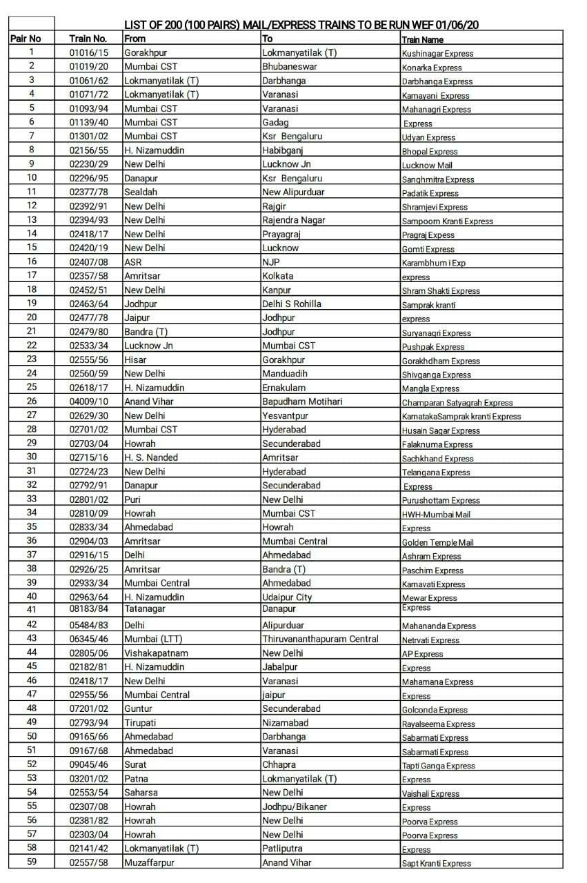 रेल मंत्रालय ने 1 जून से देशभर में 200 विशेष रेलगाड़िया ( 100 पेयर्स) शुरू करने का फैसला लिया था जिसे आज यानी कि 1 जून से शुरू कर दिया गया है। पूरे देश में 25 मार्च से लॉकडाउन लगा हुआ था लेकिन अब इसमें धीरे धीरे राहत दी जा रही है। केंद्र सरकार ने अनलॉक 1 में कई तरह की छूट दी है। देश में लॉकडाउन का चौथा चरण समाप्त होने के साथ ही 1जून से पटरियों पर 200 नियमित ट्रेनें दौड़ने लगेंगी।