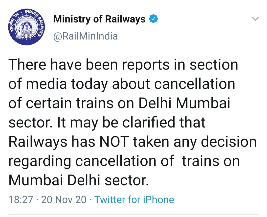 हालांकि देर शाम तक रेलवे ने ट्वीट करते हुए इस बात की घोषणा की कि, रेलवे की तरफ से अभी फाल फिलहाल कोई भी ट्रेंन कैंसिल करने की घोषणा की गई है।