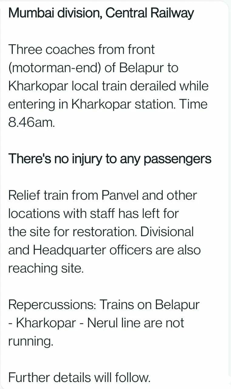 सुबह सुबह का समय होने के कारण मुंबई करो को एक बार फिर से हार्बर रेलवे पर समस्या का सामना करना पड़ा है। खारकोपर स्टेशन के पास लोकल ट्रोन हादसा होने के कारण हार्बर लोकल रेल सेवा बिधा हुई है। खारकोपर में 3 लोकल डिब्बे पटरी से उतर गए है। (Harbor Local train Railway traffic disrupted Local accident near Kharkopar station)