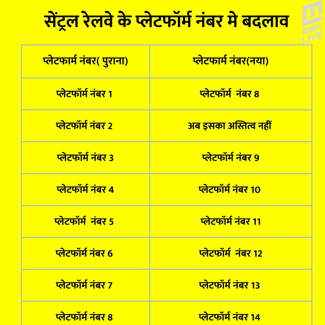सेंट्रल रेलवे की स्लो लाइन पर पहला प्लेटफॉर्म अब आठ नंबर होगा। इसी क्रम का पालन करते हुए अगली मंजिल के नंबर दिए जाएंगे। दादर टर्मिनस में प्लेटफॉर्म नंबर भी इसी क्रम में होगा। इससे सेंट्रल रेलवे पर प्लेटफॉर्म नंबर 8 की शुरुआत होगी और टर्मिनस प्लेटफॉर्म नंबर 15 होगा। (Mumbai transport news)
