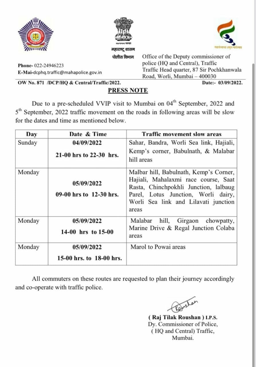मुंबईकरो से अपील है की वो ट्रैफिक अपडेट देखकर अपनी आज की यात्रा करे। राज्य में एकनाथ शिंदे और बीजेपी की सरकार बनने के बाद केंद्रीय गृहमंत्री अमित शाह सोमवार यानी की 5 सितंबर को पहली बार मुंबई दौरे पर आ रहे है। अमित शाह गणपति पंडालो में गणेश दर्शन के साथ साथ बीजेपी नेताओ के साथ बीएमसी चुनाव को लेकर बीजेपी नेताओ के साथ बैठक भी करेंगे