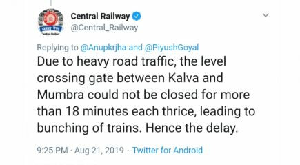 मध्य रेलवे के कलवा रेलवे स्टेशन के लेवल क्रासिंग गेट को बंद नहीं किया जा सका क्योंकि सड़क पर लंबा जाम लगा था जिससे क्रासिंग वाली सड़क पर भी वाहनों की लंबी लाइन लगी थी।