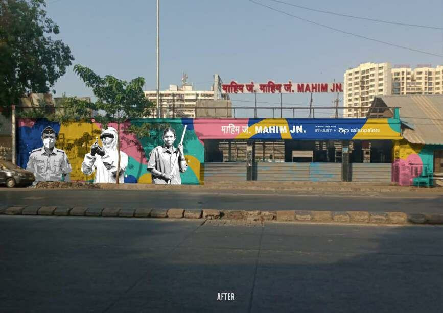 एसटी + एआरटी इंडिया फाउंडेशन और एशियन पेंट्स के सहयोग से वेस्टर्न रेलवे ने माहिम रेलवे स्टेशन के बाहरी हिस्से को द हीरोज ऑफ मुंबई ’शीर्षक से सुशोभित किया है। डॉक्टरों, नर्सों, पुलिस, सब्जी विक्रेताओं, वितरण व्यक्तियों और स्वच्छता कार्यकर्ताओं को इस पेटिंग में दिवार पर दिखाया गया है, जिन्होंने देश में जाने के लिए अथक परिश्रम किया है, ऐसी विकट परिस्थितियों में।