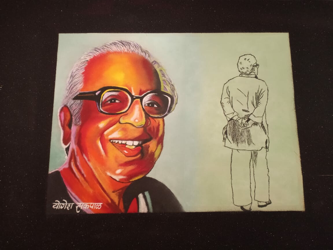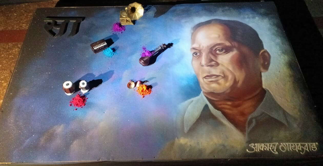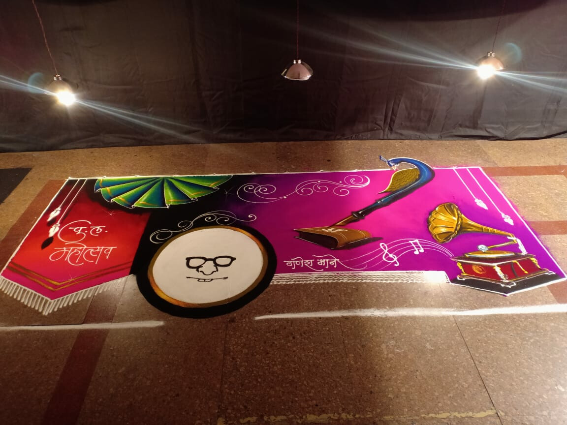गिरगावच्या 'स्वास्थरंग' परिवारातर्फे पु.ल. देशपांडे, ग. दी. माडगूळकर उर्फ गदिमा आणि बाबूजी अर्थात सुधीर फडके यांना रांगोळीतून मानवंदना देण्यात आली आहे. बाबूजींचे गीतरामायण, पुलंचे व्यक्ती आणि वल्ली, ग.दी. माडगूळकर यांच्या अजरामर कलाकृती रांगोळीतून साकारण्यात आल्या आहेत.