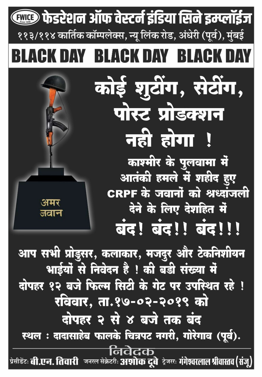 आज संपूर्ण देशभर मोर्चे काढत अतिरेक्यांच्या कृत्याचा निषेध व्यक्त करण्यात आला. अतिरेक्यांचा हा भ्याड हल्ला जिव्हारी लागलेल्या नागरिकांनी केवळ मोठ्या शहरांमध्येच नव्हे, तर लहान-सहान खेड्यांमध्येही अघोषित बंद पाळला. सर्वसामान्य नागरिकांनीही स्वत:हून या बंदमध्ये सहभागी होऊन केवळ आपल्या भावना व्यक्त केल्या नाहीत, तर शहिदांना आदरांजलीही वाहिली. यात सिनेसृष्टीही मागे नाही. फेडरेशन आॅफ वेस्टर्न इंडिया सिने एम्प्लॅाईजच्या (एफडब्ल्यूआयसी)वतीने रविवार दिनांक १७ फेब्रुवारी रोजी ब्लॅक डे घोषित करण्यात आला आहे.