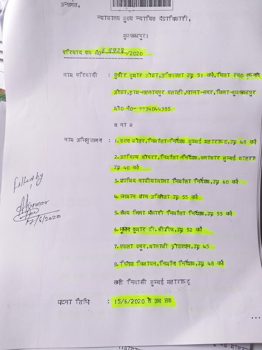 पण आता समोर आलेल्या माहितीनुसार, करण जोहर (Karan johor), सलमान खान (Salman Khan), एकता कपूर (Ekta kapoor), संजय लीला भन्साळी (Sanjay Leela Bhansali) यांच्यासह आठ जणांविरोधात पोलिसांत (Police) तक्रार दाखल करण्यात आली आहे. वकील सुधीर कुमार ओझा यांनी बिहारमधील मुझफरपूर येथील पोलिसांत तक्रार दाखल केली आहे. या सर्वांवर सुशांतला आत्महत्येस प्रवृत्त केल्याचा आरोप आहे. ओझा यांच्या म्हणण्यानुसार, त्यांनी लावलेले आरोप सिद्ध झाल्यास, या सर्वांना १० वर्षांची शिक्षा होऊ शकते.