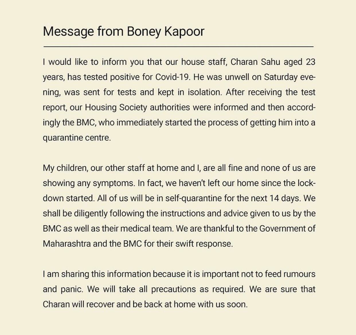 सोशल मीडियावर चाहत्यांनी चिंता व्यक्त केल्यानंतर बोनी कपूर म्हणाले, "माझी मुलं माझ्यासोबत आहेत आणि ते सर्व ठिक आहेत. माझे इतर कर्मचारीही ठिक आहेत. आतापर्यंत आमच्यापैकी कोणामध्येही कोरोनाची लक्षणं दिसली नाहीत. विषेश म्हणजे लॉकडाऊनच्या आधीपासूनच आम्ही आमच्या घरात आहोत. आम्ही घराबाहेर गेलोच नव्हतो"