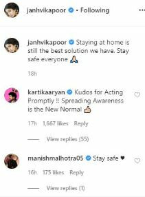 जान्हवीने लिहिले की, 'याकाळात घरात राहणे हाच सर्वात चांगला उपाय आहे. सर्व सुरक्षित रहा.' जान्हवीच्या या मेसेजवर प्रतिक्रिया व्यक्त करताना कार्तिक आर्यननं लिहिलं की, 'योग्य वेळी जनजागृती केल्याबद्दल मी तुमचे अभिनंदन करतो. जनजागृती करणं महत्वाचे आहे'. त्याचवेळी कपूर कुटुंबीयांचे निकटवर्तीय आणि प्रसिद्ध फॅशन डिझायनर मनीष मल्होत्रा यांनी जान्हवीसाठी लिहिलं की, 'सुरक्षित रहा'.