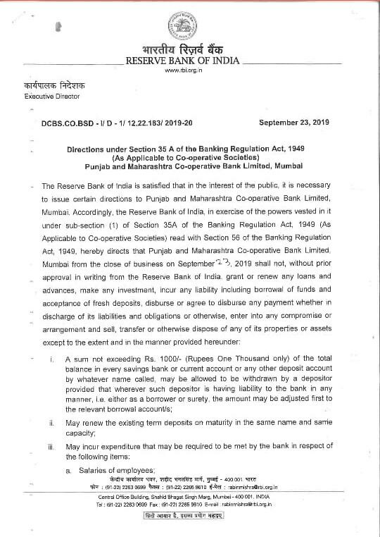 पंजाब आणि महाराष्ट्र सहकारी (PMC) बँकेवर रिझर्व्ह बँक ऑफ इंडिया (RBI)ने पुढील ६ महिन्यांसाठी आर्थिक निर्बंध लादले आहेत. या निर्बंधामुळे बँकेच्या खातेधारकांना आपल्या कुठल्याही खात्यातून केवळ १ हजार रुपये इतकीच रक्कम काढता येणार आहे. शिवाय ‘पीएमसी’ बँकेला नवी कर्ज देणं, ठेवी स्वीकारण्यावरही निर्बंध असतील.