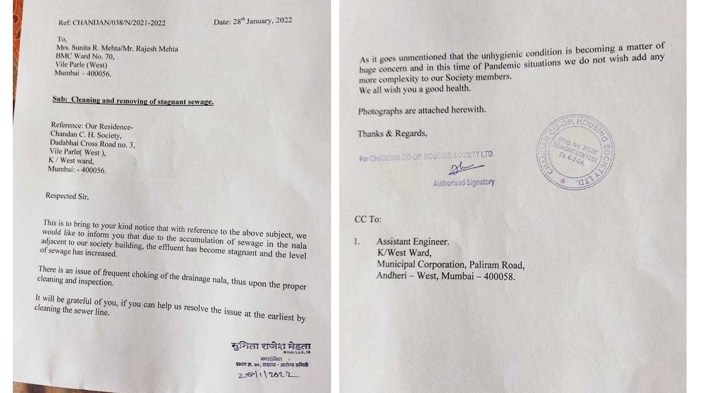 पत्रव्यवहार व संबंधित कचऱ्याचे फोटो महापालिकेला दिले असून रितसर तक्रार दाखल केली आहे. या साचलेल्या कचऱ्याची विलेवाट लावून लवकरात लवकर परिसरातील दुर्गंधी नष्ट करावी यासाठी ट्वीटरवरूनही महापालिकेला कळविण्यात आलं. मात्र अद्याप महापालिका याकडं दुर्लक्ष करत असल्याची माहिती चंदन सोसायटीमधील रहिवाशी आशिष शाहा यांनी दिली.
