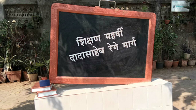 शिवसेना भवन येथील राम गणेश गडकरी चौक बेस्ट आगार ते सेनापती बापट यांचा पुतळा याठिकाणी जाणाऱ्या रस्त्याला शिक्षण महर्षी दादासाहेब रेगे यांचे नाव देण्यात आले आहे. या नामकरणाची पाटी सेनाभवनच्या सिग्नलजवळ बसवण्यात आली आहे. शालेय पाटीच्या आकारात लक्षवेधी नामकरणाचा फलक विटांचे बांधकाम करून बसवण्यात आला होता. परंतु, गेल्या काही दिवसांपासून पाटीच्या खालील विटांचा भाग निखळून पाटीचा फलक तुटलेल्या अवस्थेत पडला होता. त्यामुळे कोणत्याही क्षणी ही पाटी निखळून पडण्याची शक्यता होती.