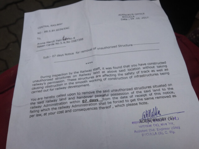 2 तारखेला रेल्वे अधिकाऱ्यांनी आमच्या घरांचा सर्व्हे केला. पण, 4 तारखेला दुपारी पुन्हा काही अधिकारी एक इंग्रजी नोटीस घेऊन आले. त्यांनी आम्हाला सांगितलं की यावर सही करा. आम्ही विचारलं तर ते म्हणाले कि तुम्हाला शिफ्ट करणार आहोत. आमच्याकडे सर्व प्रकारची कागदपत्र आहेत. पण, तरीही ते बोलतात की आम्ही अनधिकृतरीत्या राहतो.