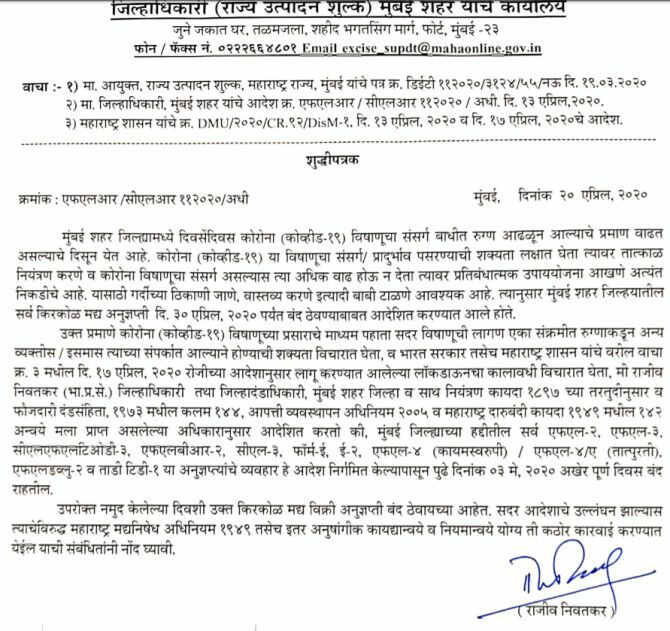 तर, जिल्हाधिकारी राजीव निवतकर यांनी परिपत्रक काढत ३० एप्रिलपर्यंत बंदी घालण्यात आलेला मद्यविक्रीचा (mumbai collector) आदेश ३ मे पर्यंत लागू असणार असल्याचं स्पष्ट केलं आहे.