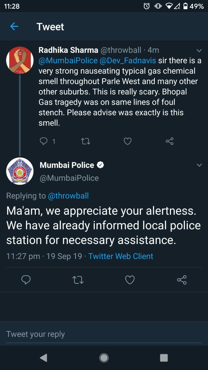 गॅस गळती संदर्भात ट्वीटरवर देखील अनेकांनी तक्रारी केल्या आहेत. राधिका शर्मा या महिलेनं मुंबई पोलिस आणि मुख्यमंत्री देवेंद्र फडणवीस यांना टॅग करत ट्वीटरवर गॅस गळती संदर्भात माहिती दिली. मुंबई पोलिसांनी राधिका यांच्या ट्वीटला तात्काळ उत्तर दिलं. “स्थानिक पोलिसांना यासंदर्भात माहिती देण्यात आली आहे. तुमच्या सहकार्यासाठी धन्यवाद,” असा रिप्लाय राधिकाला पोलिसांनी दिला.