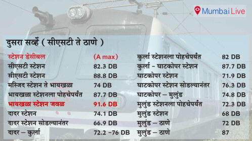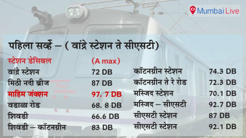 सर्व्हेमध्ये सर्वात जास्त डेसिबल आवाज हा माहिम जंक्शन ( 97.7 ) आणि भायखळा स्टेशन (91.6 ) या दोन स्थानकांवर आढळून आला. नव्या लोकल्स जुन्या लोकल्सपेक्षा जास्त आवाज करतात, हेही यात नमूद करण्यात आले आहे. प्रवाशांचा आवाज, लोकलमध्ये गाणारी भजनी मंडळी, रेल्वेच्या घोषणा यातून निर्माण झालेला आवाज दररोज ट्रेनमधून प्रवास करणाऱ्या मुंबईकरांच्या जीवावर बेतू शकतो. या आवाजामुळे मानसिक तणाव, श्रवणशक्ती, ध्वनी प्रदूषण या सर्व परिणामांना प्रवाशांना सामोरं जावं लागतं.