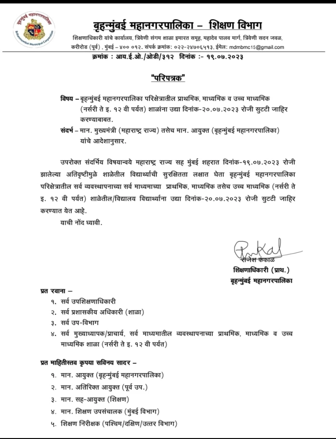 पावसाळ्याच्या पार्श्वभूमीवर आपल्या कार्यकक्षेतील परिस्थिती विचारात घेता आपत्तीच्या पूर्वसूचनेवरून, हवामान खात्याच्या अंदाजावरून तसेच त्या त्या भागातील पावसाच्या सद्यस्थितीचा तसेच त्या अनुषंगाने स्थानिक परिस्थितीचा आढावा घेऊन आपल्या स्थानिक क्षेत्रातील शाळांना सक्षम प्राधिकरण यांच्या मान्यतेने सुट्टी जाहीर करण्याबाबत योग्य ती कार्यवाही करावी, अशा सूचना शिक्षण उपसंचालकांनी दिले आहेत.