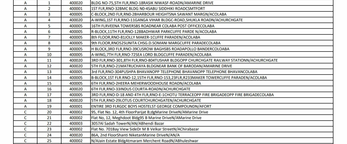 तर, दुसरीकडे महापालिकेने (bmc) मुंबईतील ७०० हून इमारती सील केल्या आहेत. मुंबईतील ए (A) आणि सी (C) वाॅर्डातील पूर्ण/ आंशिक सील इमारतींची यादी पुढीलप्रमाणे: ही यादी ५ एप्रिल २०२१ रोजी प्रसिद्ध करण्यात आली असून कोरोनाबाधितांच्या संख्येनुसार काही इमारतींची नावं वगळण्यात आलेली असू शकतात किंवा नवीन नावांचा समावेशही झालेला असू शकतो. अद्ययावत माहितीसाठी मुंबई महापालिकेच्या https://stopcoronavirus.mcgm.gov.in/ संकेतस्थळाला भेट द्यावी.
