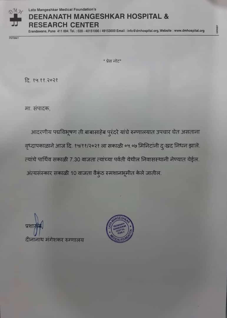 रुग्णालयाने जारी केलेल्या पत्रकानुसार पहाटे ५ वाजून ७ मिनिटांनी बाबासाहेबांचं निधन झालं. 'आदरणीय पद्मविभूषण बाबासाहेब पुरंदरे यांचे रुग्णालयात उपचार घेत असताना वृद्धापकाळाने आज दिनांक १५ नोव्हेंबर २०२१ रोजी सकाळी ५ वाजून ०७ मिनिटांनी दु:खद निधन झाले. त्यांचे पार्थिव सकाळी ७ वाजून ३० मिनिटांनी त्यांच्या पर्वती येथील निवासस्थानी नेण्यात येईल. अंत्यसंस्कार सकाळी १० वाजता वैकुंठ स्मशानभूमीत केले जातील', असं दिनानाथ मंगेशकर रुग्णालयाने जारी केलेल्या पत्रकात म्हटलं.