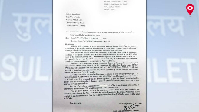 राईट टू पीअंतर्गत लघुशंकेसाठी पैसे आकारू नये असा नियम आहे. याबरोबरच शौचालयाच्या स्वच्छतेचा दर्जा ठरवण्यासाठी बसवण्यात आलेल्या मशिनमध्येही 83 टक्के लोकांनी हे शौचालय अस्वच्छ असल्याचे तसेच तिथे दुर्गंधी असल्याचा कौल दिल्यामुळे या संस्थेचा करार संपुष्टात आणून त्यांची हकालपट्टी करण्यात आल्याची माहिती घनकचरा विभागाचे तसेच ए विभागाचे सहायक आयुक्त किरण दिघावकर यांनी दिली आहे. या संस्थेला यापूर्वी नोटीस देत समजही देण्यात आली होती. परंतु त्यानंतरही सुधारणा न झाल्यामुळे ही कारवाई करावी लागली असल्याचे दिघावकर यांनी स्पष्ट केले.
