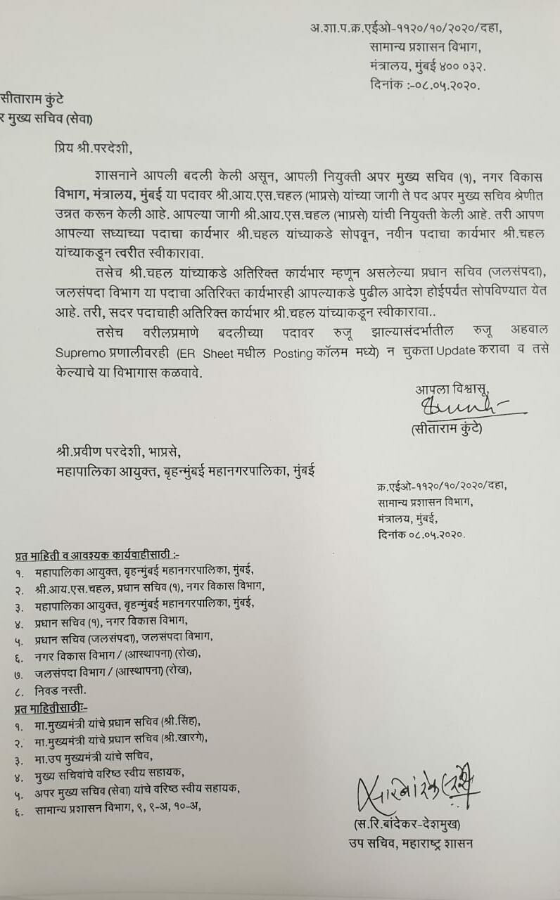 एकाबाजूने मुंबईत कोरोनाने थैमान घातलेलं असताना मुंबई महापालिका आयुक्त प्रवीण परदेशी यांची तडकाफडकी बदली करण्याचा निर्णय राज्य सरकारने शुक्रवार ८ मे २०२० रोजी घेतला आहे. परदेशी यांच्या जागी नगरविकास विभागाचे प्रधान सचिव असलेल्या इक्बाल चहल यांच्याकडे मुंबई पालिका आयुक्तपदाची सूत्रे सोपवण्यात आली आहेत.