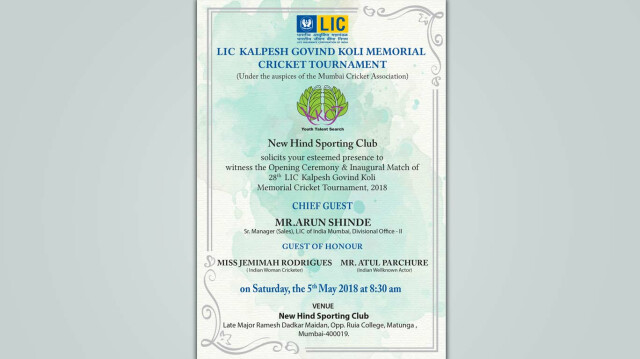 मुंबईलाच नव्हे तर देशाला राष्ट्रीय अाणि अांतरराष्ट्रीय दर्जाचे अव्वल क्रिकेटपटू देणाऱ्या कल्पेश गोविंद कोळी स्मृति चषक क्रिकेट स्पर्धेला ५ मे २०१८ पासून सुरुवात होत अाहे. मुंबई क्रिकेट असोसिएशनच्या (एमसीए) मान्यतेने होणारी ही स्पर्धा म्हणजे उन्हाळी प्रशिक्षण शिबिरातील १६ वर्षांखालील मुलांसाठी एक पर्वणीच ठरू लागली अाहे. न्यू हिंद स्पोर्टिंग क्लबतर्फे गेली २७ वर्षे शिस्तबद्ध पद्धतीने या स्पर्धेचे अायोजन करण्यात येत अाहे.