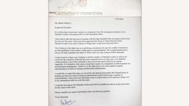 एक क्रिकेट प्रशासक या नात्याने उदात्त असा पायंडा अाम्ही पाडत असतो. अनेकांनी त्याचे अनुकरण करावे, असा अामचा हेतू असतो. त्याच मार्गावरून माझीही वाटचाल सुरू अाहे. माझ्या व्यावसायिक बांधीलकीसाठी मी एमसीएच्या सदस्यपदाचा राजीनामा देत अाहे.