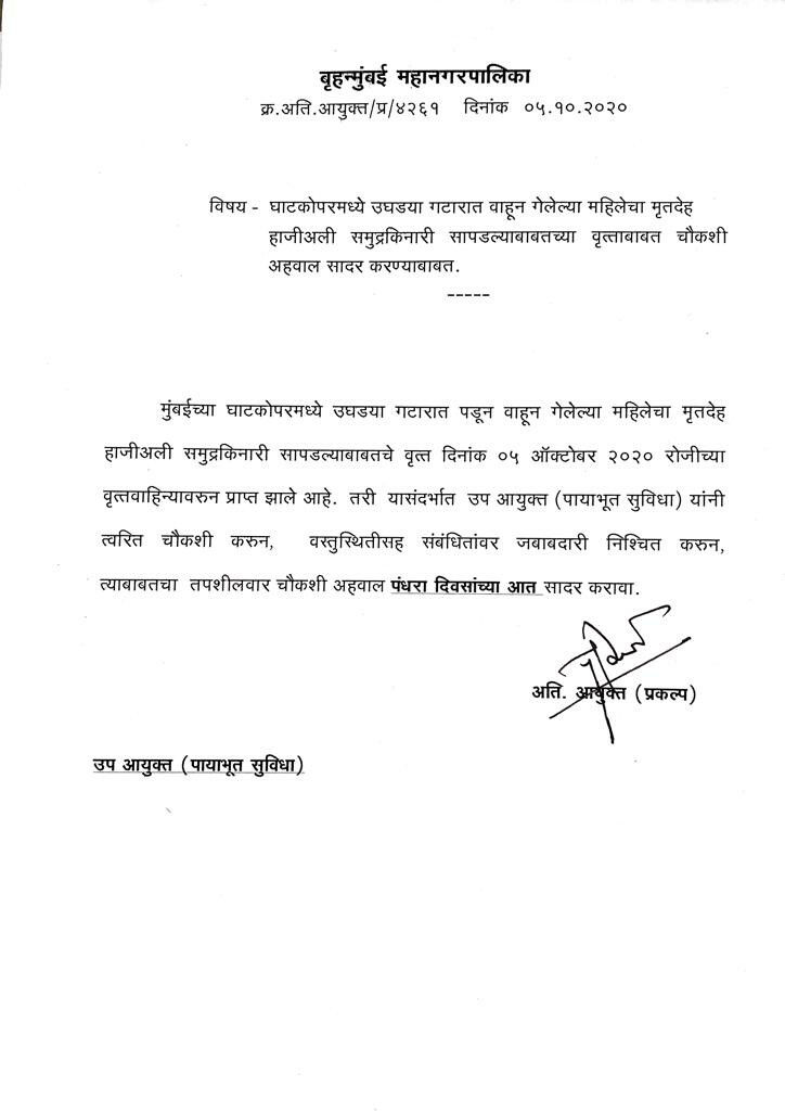 त्यामुळेच मुंबई महापालिकेचे अतिरिक्त आयुक्त पी वेलारासू यांनी उपायुक्तांना या प्रकरणी चौकशी करुन १५ दिवसांत अहवाल सादर करण्याचे आदेश दिले आहे. या प्रकरणी आजूबाजूचे सीसीटीव्ही फुटेज तपासून काही धागेदोरे मिळतात का हे पाहिले जात आहे. शिवाय मृतदेह मिळाल्याप्रकरणी ताडदेव पोलिसात अपमृत्यूची नोंद करण्यात आली आहे. या प्रकरणी पोलिस अधिक तपास करत आहेत.
