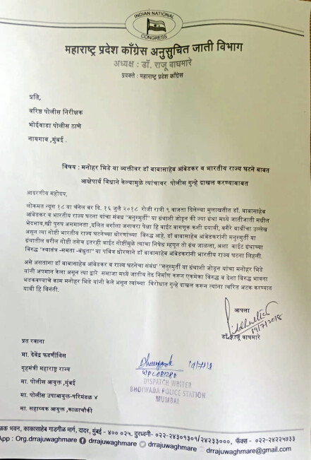 मुंबईतील एका नामंकित वृत्त वाहिनीला दिलेल्या मुलाखतीत शिवप्रतिष्ठान संघटनेचे संस्थापक संभाजी भिडे यांनी डाॅ. बाबासाहेब आंबेडकर आणि राज्यघटनेबाबत आक्षेपार्ह विधान केल्याने त्यांच्याविरोधात गुन्हा नोंदवण्यात यावा. यासाठी महाराष्ट्र प्रदेश काँग्रेस अनुसुचित जाती विभागाचे अध्यक्ष राजू वाघमारे यांनी भोईवाडा पोलिस ठाण्यात लेखी तक्रार केली आहे.