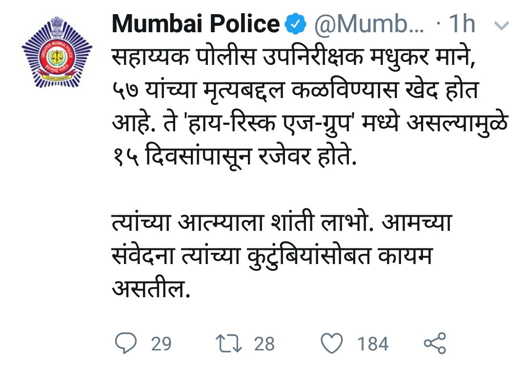 मुंबई पोलिस दलात मृत पोलिस कर्मचारी हे सहाय्यक पोलिस उपनिरीक्षक पदावर कार्यरत होते. मुंबईत कोरोनाचा वाढता प्रादुर्भाव लक्षात घेता. पोलिस दलातील 50 वर्षावरील कर्मचाऱ्यांना त्याचा जास्त धोका आहे. हे लक्षात घेऊन मुंबई पोलिस आयुक्त परमबीर सिंग यांनी 50 वर्षावरील कर्मचाऱ्यांना ड्युटीवर न येता घरीच थांबण्याचे आदेश दिले. यांचे वय 57 असल्याने ते हाय रिस्क एज ग्रुपमध्ये मोडत होते. त्यामुळे ते मागील 15 दिवसांपासून रजेवर होते. माञ शुक्रवारी मधुकर माने यांचे निधन झाल्याचे पोलिसांनी ट्विटरच्या माध्यमातून कळवले.