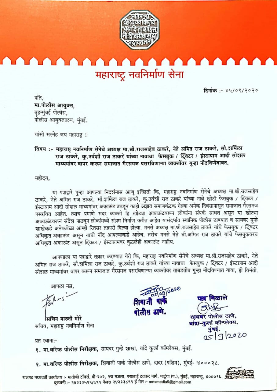 सुशांत सिंह राजपूत प्रकरणात वेळोवेळी मुंबई पोलिसांवर टिका करणाऱ्या कंगणा रणौतची बाजू मनसे अध्यक्ष राज ठाकरे घेत असल्याचे सोशल मिडिया दिसत होते. मात्र या सर्व अकाऊन्टची वस्तूस्थिती पडताळल्यानंतर नुसते राज ठाकरे यांचेचं नाही. तर राज यांच्या पत्नी शर्मिला ठाकरे, मनसे नेते अमित ठाकरे कन्या उर्वशी ठाकरे यांच्या नावानेही बनावट अकाऊन्ट सुरू करून कुणीतरी जाणीव पूर्वक खोडसाळपणा केल्याचे निदर्शनास आले आहे. या प्रकऱणी मनसेचे सचिव सचिन मोरे यांनी शिवाजी पार्क पोलिस ठाण्यात तक्रार नोंदवली आहे.